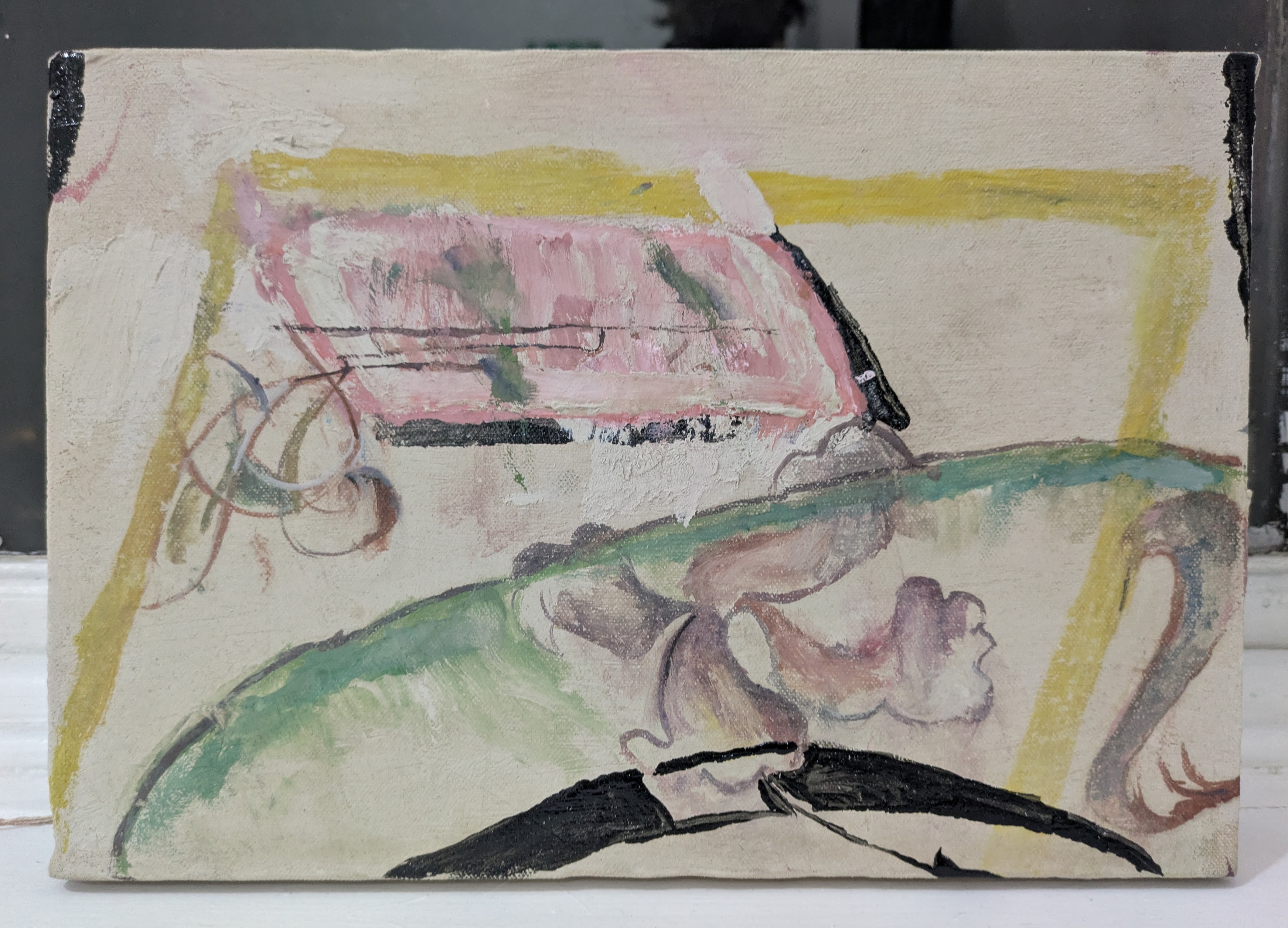 'Beginning Ending', 2025, Oil on found curtain, 100cm x 150cm