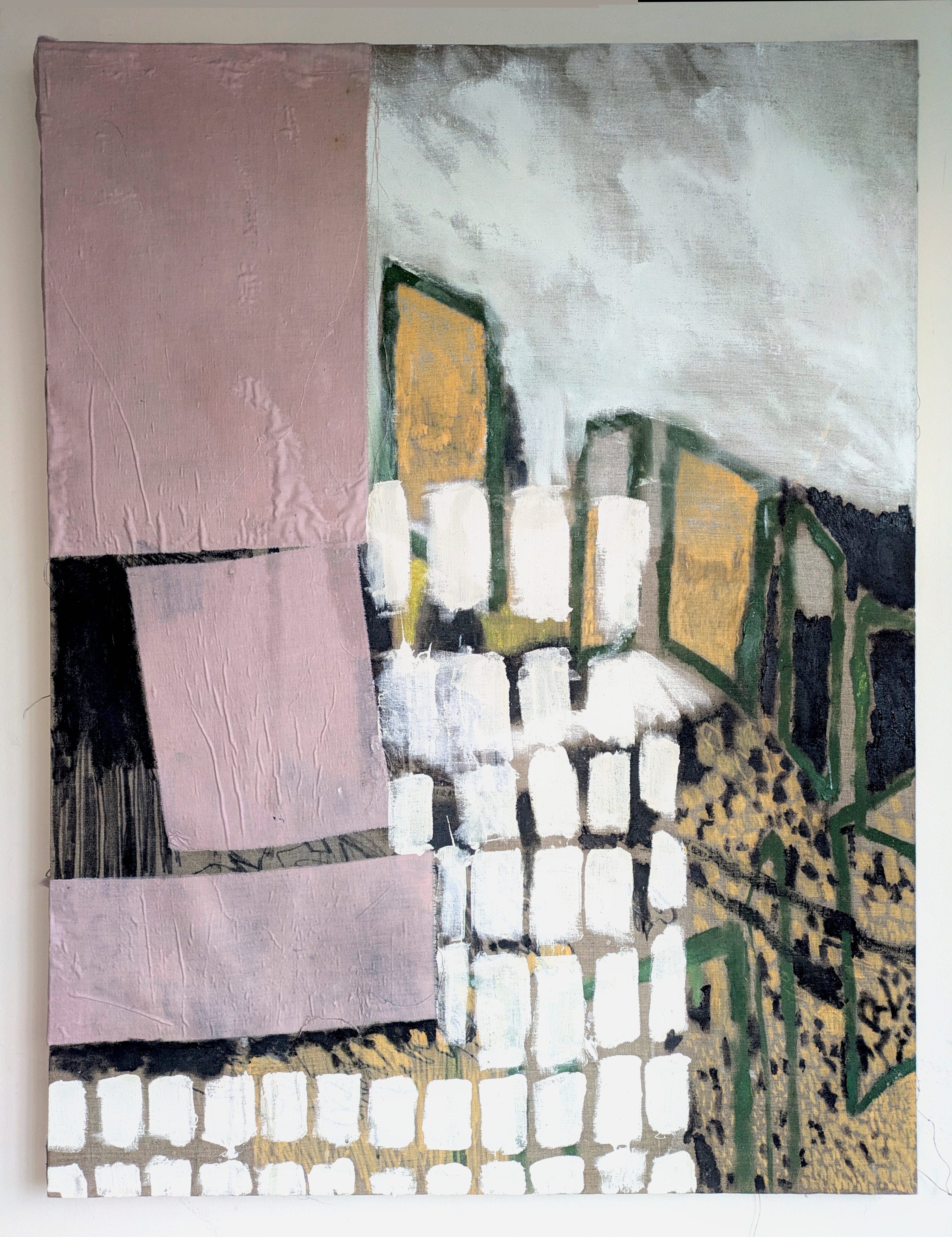 'Shields Road', 2025, Oil and found curtain on canvas, 100cm x 80cm